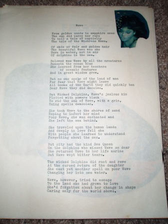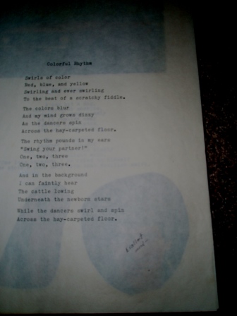 The pages are yellowed, most typed on a typewriter (look it up on Wikipedia if you’ve never used one) that made extra bold periods. A few pages were hand-written (obviously didn’t negatively impact my grade). Several have clippings I pasted from magazines to serve as illustrations. All the pages were bound together in one of those clear portfolios with the plastic thingy that slid down the side, pinching all the sheets together. Only the top half of the plastic portfolio remains. I lost the back half and the binder thingy long ago.