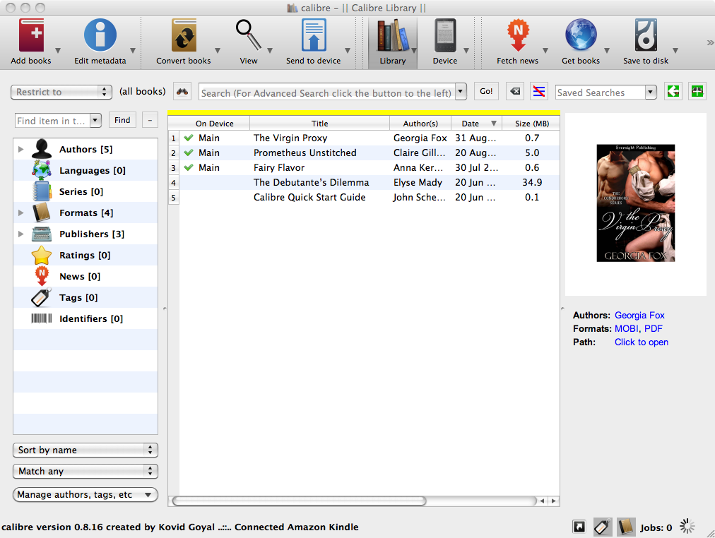 Plug your Kindle into your PC or Mac and give it a second for your computer to acknowledge it has a lovely new drive attached. Your Calibre program will add a couple of new icons at the top: “Send to Device” and “Device”