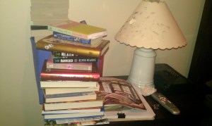 I’m drowning in books! My nightstand barely has space for my alarm clock and a drink. Behold Exhibit A: