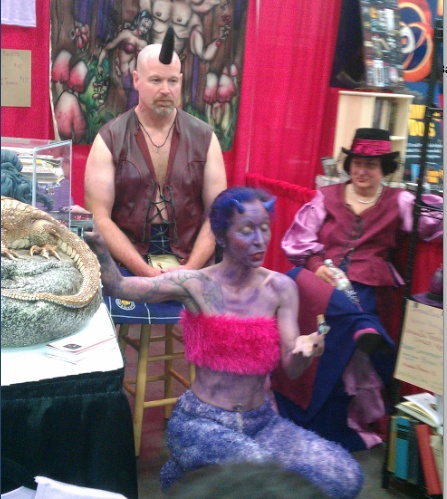 Later, as I strolled through the exhibits, I saw a lady painted purple with goat legs and hooves and two little horns on her forehead.  Sitting behind the woman as she talked to the kids who strolled by was kilt guy.  So, I took a picture because I realized they were in costume for their booth, purpose unknown to me at the time.  I didn’t want to draw attention to my photo-taking because I’ve had punk rockers in London chase me down insisting I pay them for the privilege of having taken their photos. While I didn’t expect kilt guy to tackle me and confiscate my cell phone, I was still a little nervous about taking it without asking.  Plus, they were chatting with children visiting their booth.